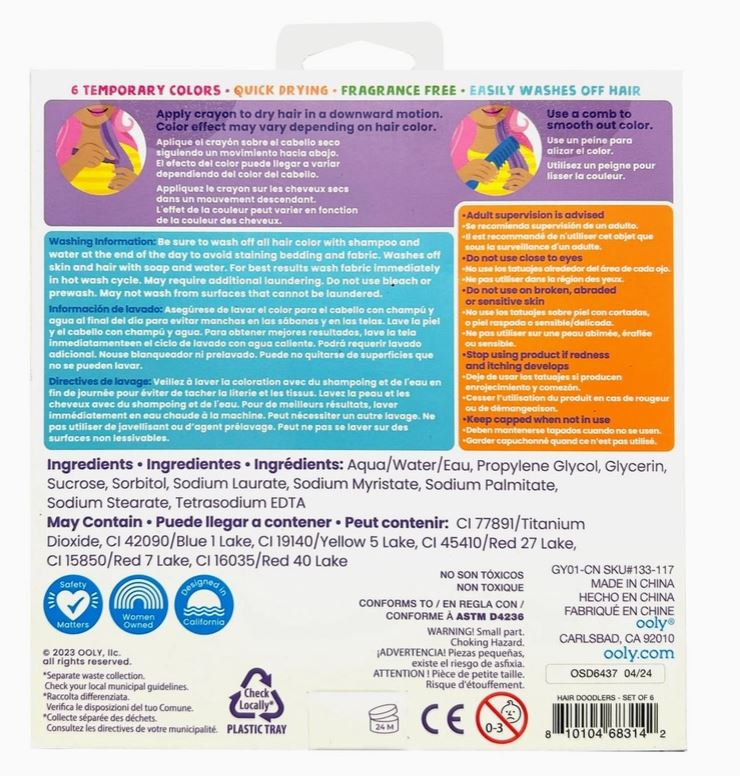 Express your unique style with OOLY's Hair Doodlers, a set of 6 vibrant, washable hair crayons designed to add a splash of colour to your hair. Perfect for creating colourful streaks, funky patterns, and imaginative designs, these crayons let you transform your hair into a canvas of creativity. Ideal for parties, festivals, or just everyday fun, Hair Doodlers are easy to use and safe for all hair types. The non-toxic formula ensures they are gentle on your hair and easily washable with shampoo.